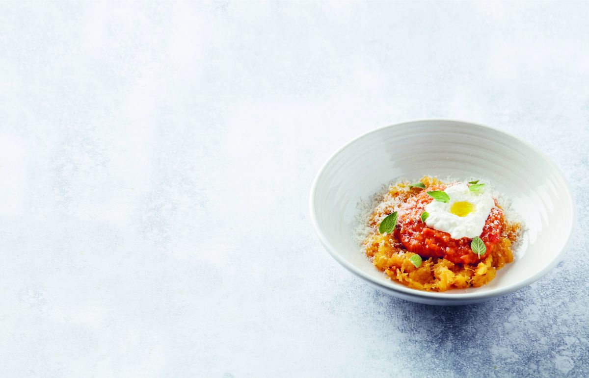 Spaghettipompoen met tomaat, burrata, & oregano