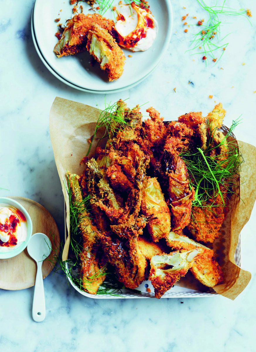 Tip : Vooral kleine of jonge venkel leent zich goed voor dit recept. Snijd de venkel in vieren als fingerfood – of zelfs door de helft als ze echt klein zijn. De venkelpartjes kunnen van tevoren worden geblancheerd. Paneer ze net voor het frituren – paneer je ze te vroeg, dan worden ze zompig. Glutenvrij : Rijstkruimels of quinoavlokken frituren mooi op een jasje van glutenvrij meel. Voor veganisten: Gepureerde avocado met citroensap is een lekker dipalternatief. Gebruik de overgebleven vloeistof in een blik bonen of kikkererwten (de ‘aquafaba’) ter vervanging van de eieren bij het paneren.