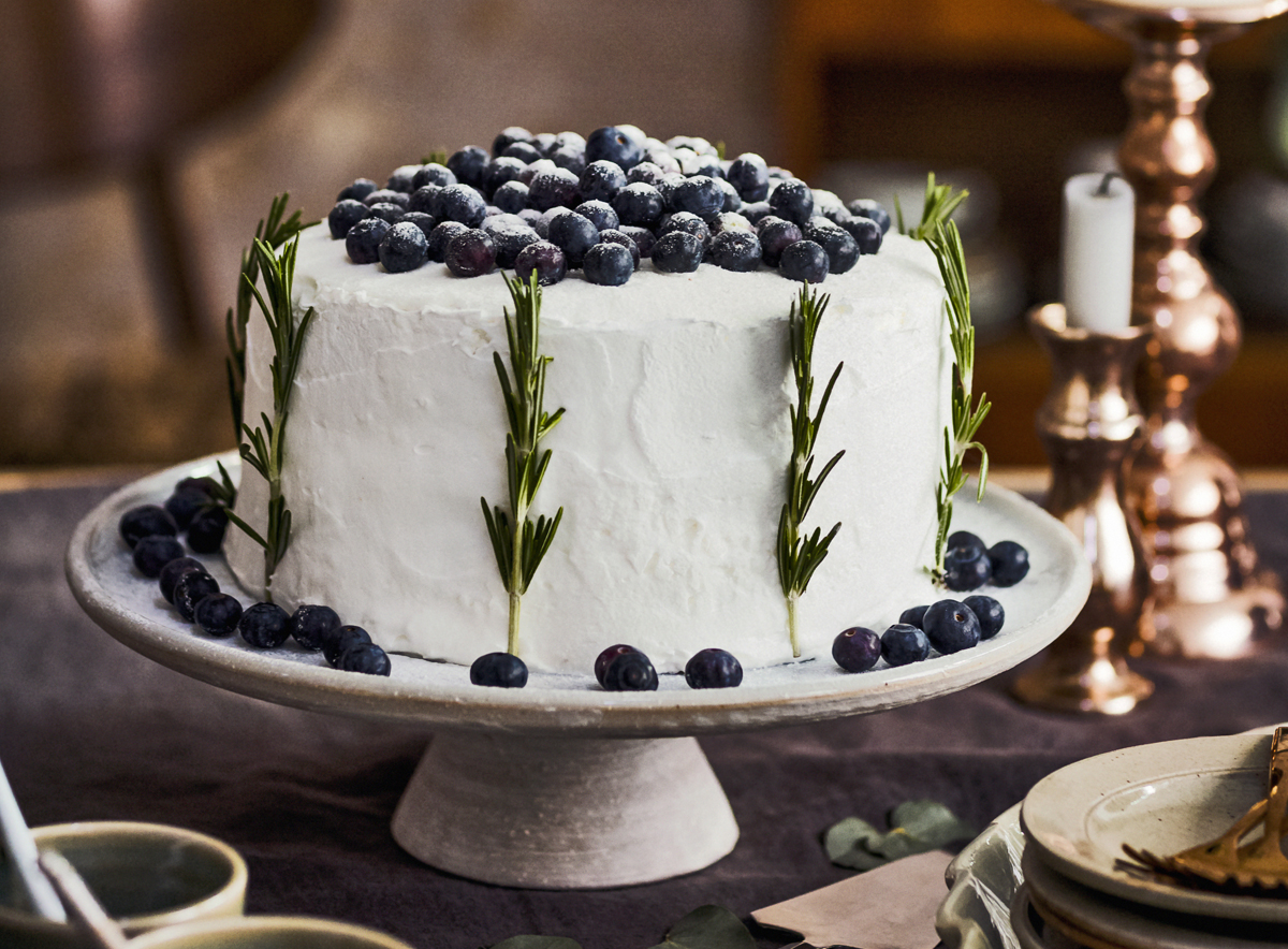 - Smeer de taart in met de icing en decoreer met bosbessen en takjes rozemarijn.