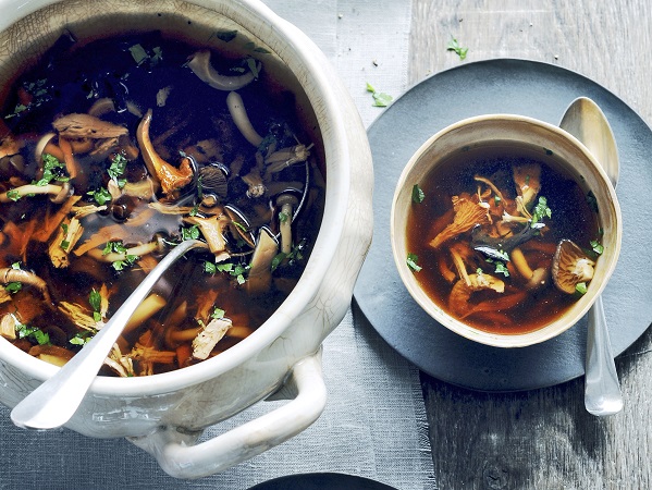 Wilde paddenstoelensoep die binnen het uur op tafel staat – dat is wel fijn na een lange wandeling- en allerlei heerlijks in zich heeft uit de natuur. Hier vind je het recept. De fazant is een van de meest voorkomende wildsoorten in de Achterhoek. Hij heeft een milde smaak die goed tot zijn recht komt in deze heldere bouillon met wilde paddenstoelen. Serveer de soep samen met crackers besmeerd met paddenstoelencrème en je hebt een heerlijk landelijke maaltijd. | Voorgerecht | Voor 4 personen | Bereiding circa 50 minuten | Ingrediënten wilde paddenstoelensoep