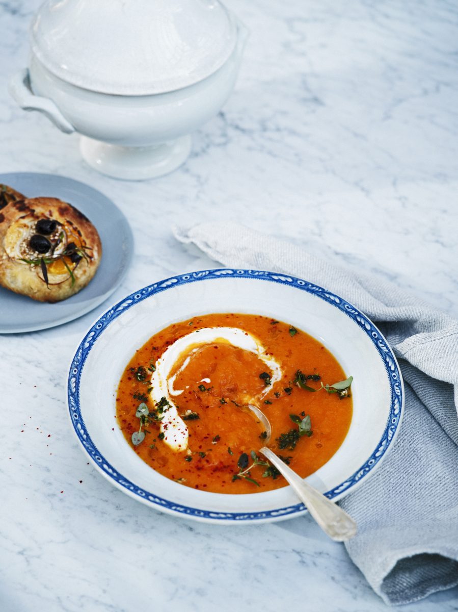 Wortelsoep met sinaasappel, tijmgremolata en crème fraîche