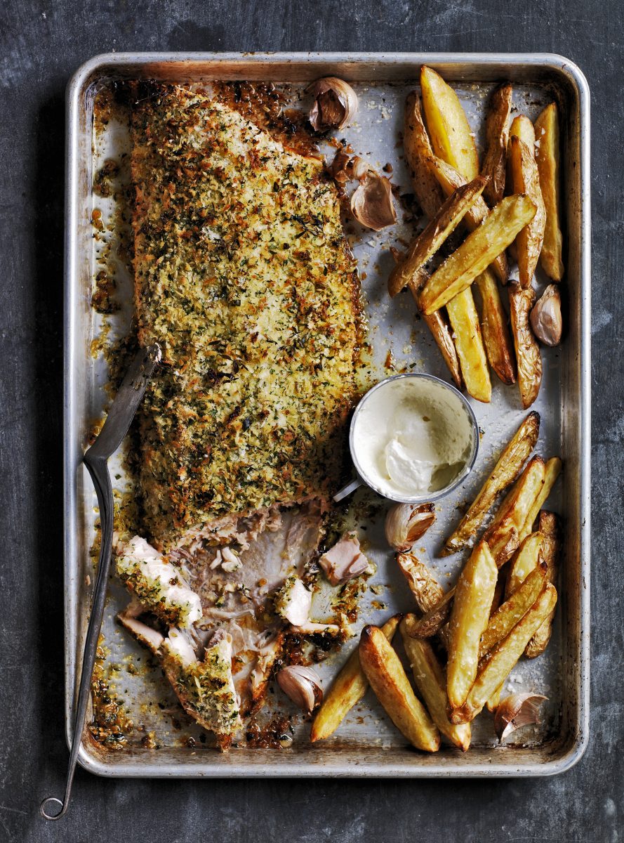Zalm in een kruidenkorst van verse kruiden en panko, geserveerd met mierikswortelsaus. Samen met de knoflookaardappelen een heus feestmaal. Het smaakt trouwens ook heerlijk op een ‘gewone’ dag.