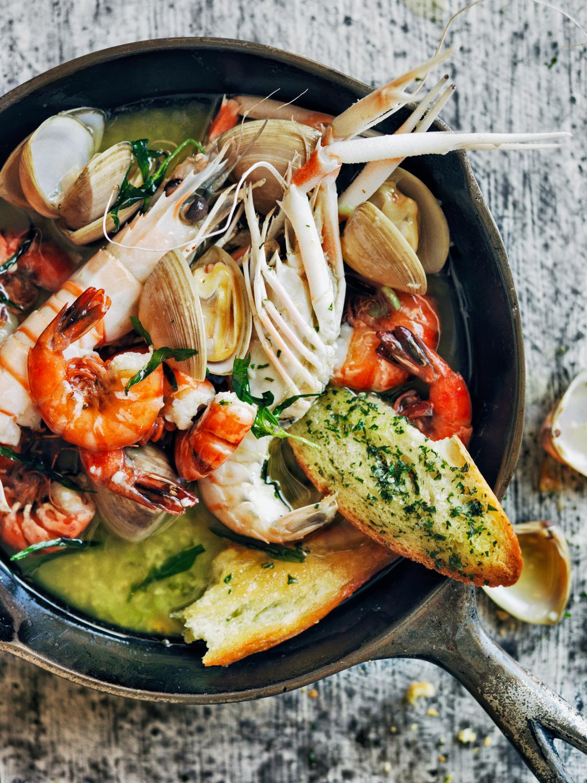 - Serveer de zeevruchtenhotpot met de kruidentoast.