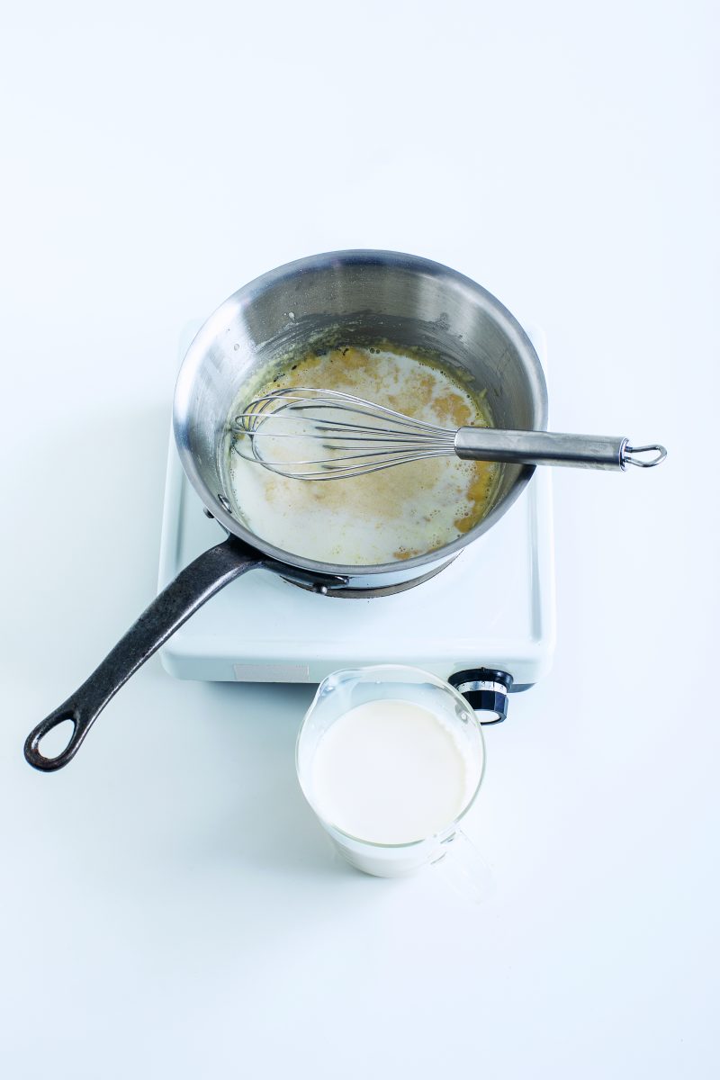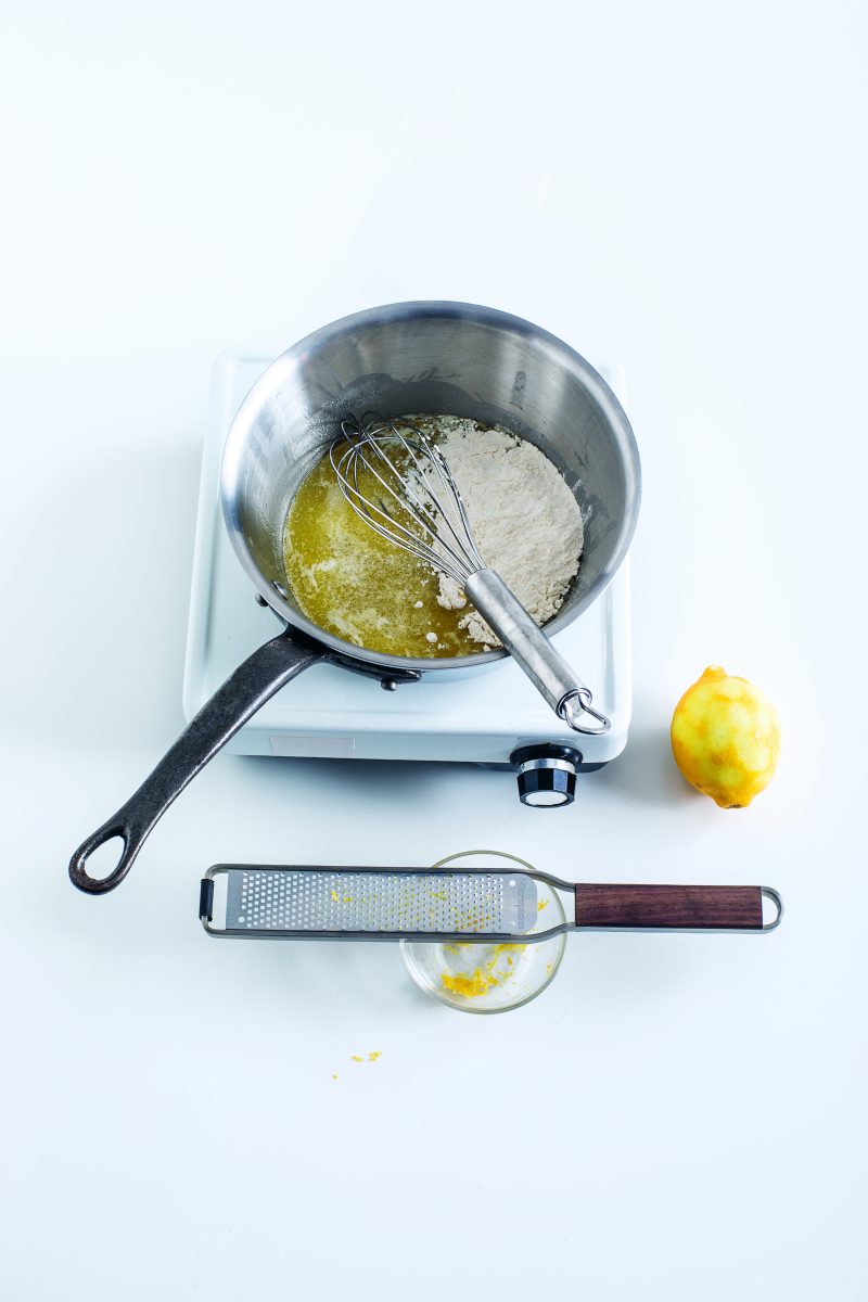 - Strooi de bloem al roerend met een garde bij de gesmolten boter. Bak 1 tot 2 minuten, tot de roux goed gebonden is maar niet te donker kleurt.