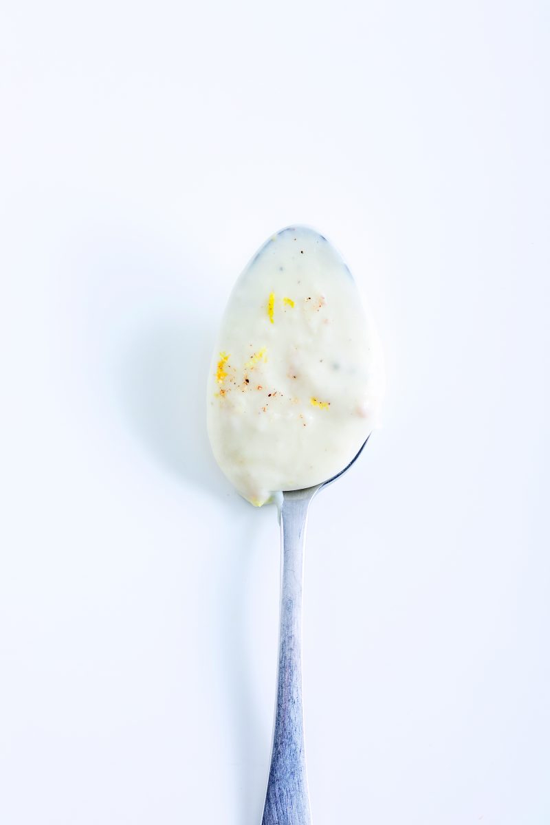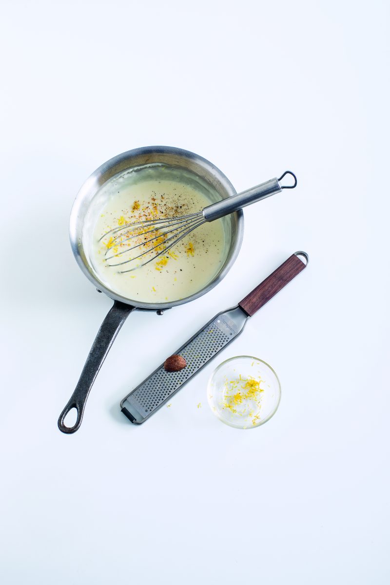 - Breng aan de kook en laat 30 seconden koken. Haal de pan van het vuur en breng de saus op smaak met een snufje versgeraspte nootmuskaat, de citroenzeste en zout en peper.
