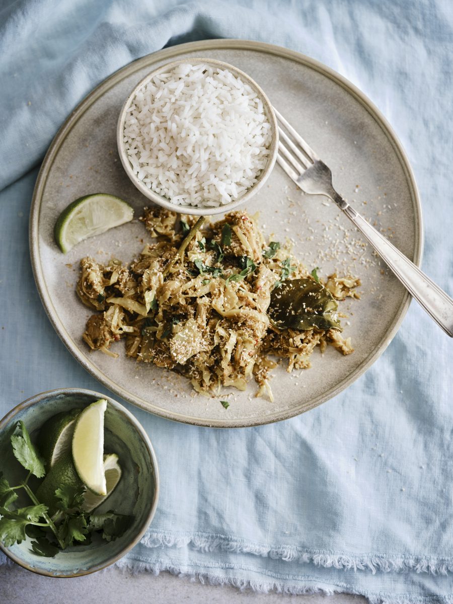 - Verdeel de rijst en de jackfruitrendang over de borden en serveer met een limoenpartje. Garneer met overgebleven kokosrasp en koriander.