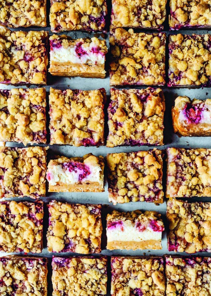 “Met citroen geïnfuseerde cheesecake, afgewerkt met heerlijke frambozen, zijn zonder meer al geweldig. Ik wilde ze toch iets spectaculairder maken, en daarom krijgen ze nog een kruimellaag waardoor ze een prachtige textuur krijgen. Hoewel je nu misschien denkt dat je een extra laag moet maken, maak je eigenlijk een grotere hoeveelheid van de bodem en houd je daar een kleine hoeveelheid van achter die je over de cheesecake kruimelt. Ik vind ze heerlijk bij een kop thee en snijd ze dan in wat kleinere vierkantjes, als een soort friandise, maar je kunt ze ook, net als brownies, in een wat groter formaat snijden.”