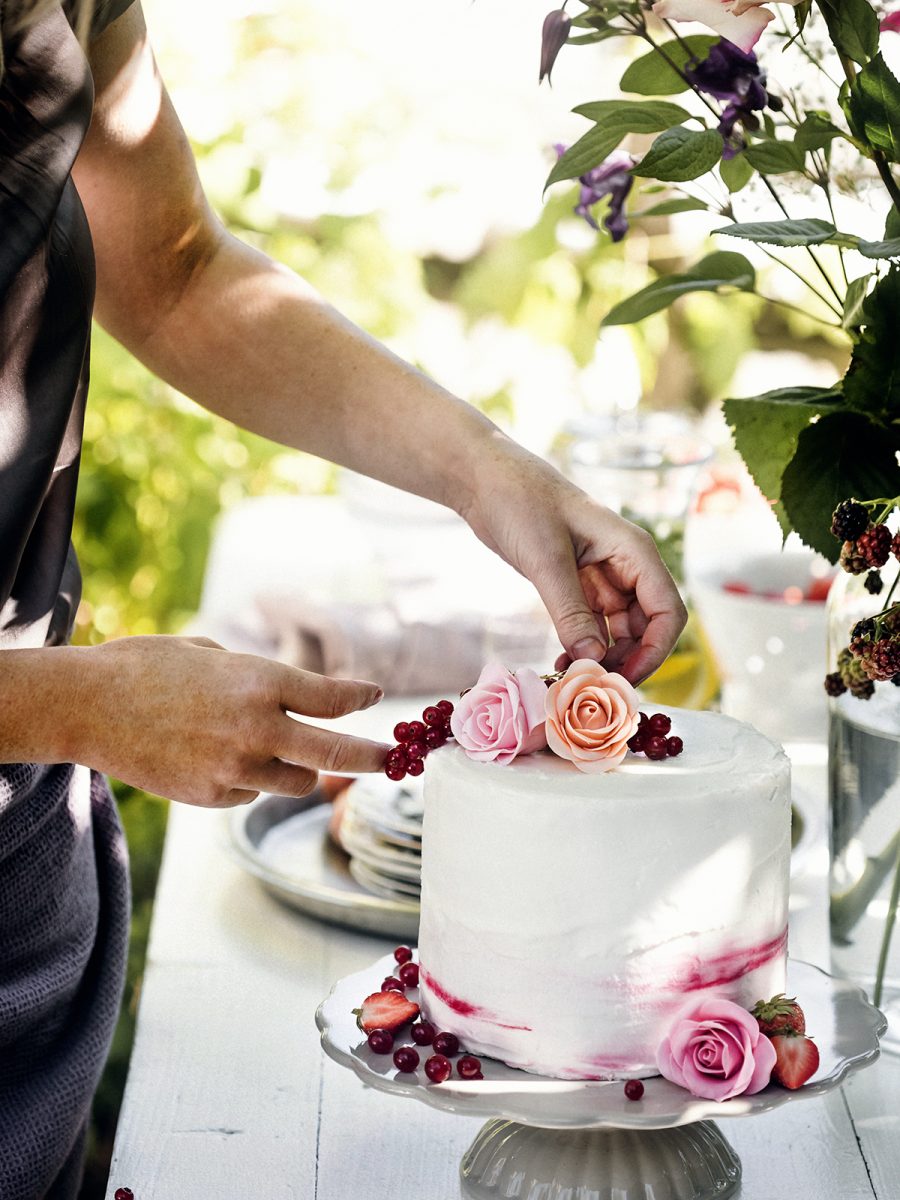 - Decoreer de taart met vers zomerfruit en roosjes van fondant (of marsepein).