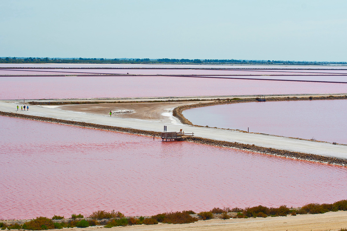 In een jeep rijden we door een land-schap van eindeloze zoutpannen. De bekkens hebben subtiele kleur-schakeringen met zilverkleurige, blauwe, groene en roze tinten. Elk jaar wordt hier 500 ton fleur de sel geoogst. Werk dat om een lange adem vraagt en dat start in de Middellandse Zee – waarbij het traditionele werk van de sauniers een belangrijke rol speelt.