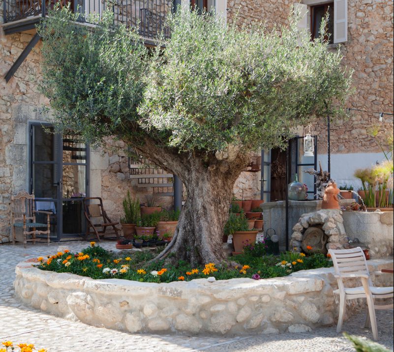 Wastafelplanken van olijfhout. Regenpijpen van terracotta. Een vloer van kiezelstenen. Op de funca van de Nederlandse Jacqueline Rozenhart en Zuid-Afrikaanse Glynn Jones is alles gemaakt van traditioneel, liefst lokaal gevonden, materiaal. Toen het paar de boerderij uit 1570 ontdekte, was het dak half ingestort en de tuin – een terrein van 6.000 m2 – een woestenij van bramen. “Toch voelden we allebei dat dit de plek was waarnaar we op zoek waren”, vertelt Jacqueline. Het stel woonde al een tijdje op Mallorca in een huurhuis en zocht naar een landelijke locatie om permanent te wonen en gasten te ontvangen. “Dat het huis geen binnenmuren had, alleen maar een keuken met vuurplaats, was wel even slikken. Tegelijkertijd gaf het ook ruimte. Nu konden we het huis indelen zoals wij wilden. Onze droom, een hotel, was opeens te verwezenlijken.”