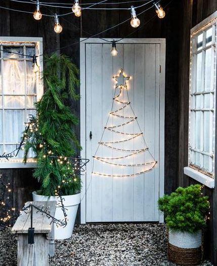 Lichtjes maken de boom. 110 lampjes op een swingende contour van metaal vormen samen een kerstboom met ster, h 110 x b 78 cm, €29,99. www.intratuin.nl