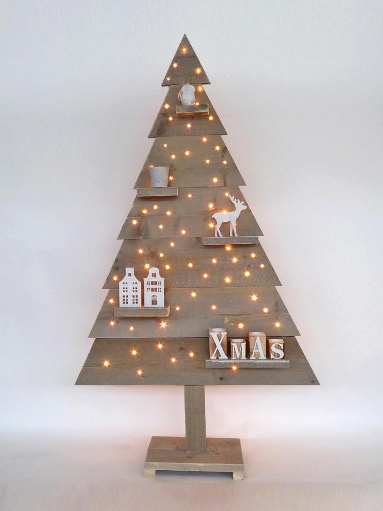 Deze kerstboom van steigerhout, h 170 x b 95 cm, komt inclusief led-verlichting met ingebouwde timer en dimmer, €74,95. Fresca via www.gadero.nl.