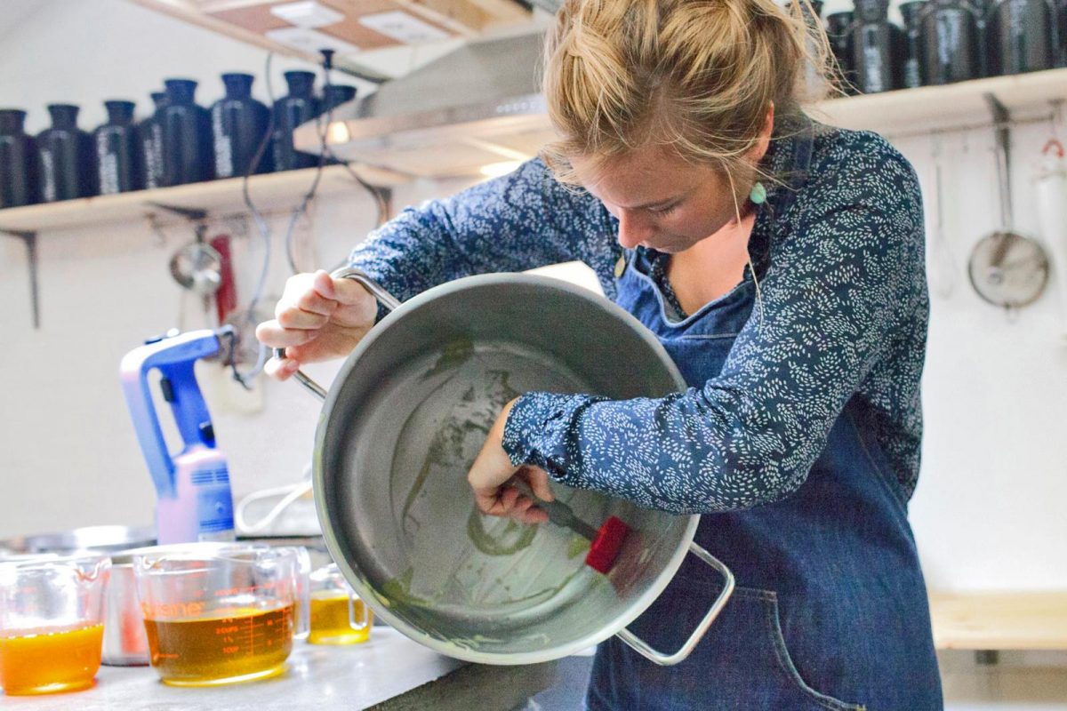 Een reis door Canada zette Evelien en haar partner Laurens van der Wee in 2009 op het zeepspoor. In een van de boerderijen waar ze logeerden, werd op ambachtelijke wijze biologische zeep gemaakt. “Ik heb een gevoelige huid en gebruikte nooit zeep. Maar deze zeep bleek verrassend mild”, vertelt Evelien. In Canada leerde het stel de beginselen van het zeepzieden. Terug in Nederland experimenteerden ze verder in de oude werfkelder van een Utrechts grachtenpand. “Die zeep was op zo veel manieren ráák voor mij. Liefde voor planten was er altijd al. Net als passie voor het ambacht: ik heb de kunstacademie gedaan en studeerde af op houtbewerking. Ook was ik helemaal in de ban van het idee dat ik zo’n mooi, natuurlijk product gewoon zélf kon maken.” Al snel bouwde Evelien een vaste klantenkring op. De verhuizing naar het Wickenburghse bos bij Houten bracht de ontwikkeling van het bedrijf in een stroomversnelling. Ze ontdekte er niet alleen mooie ingrediënten voor haar zeep; ze kreeg ook de toestemming om deze te oogsten. De agenda van Werfzeep wordt grotendeels bepaald door de seizoenen. Elke plant, wortel of bloem wordt geoogst op het beste moment. “De paardenkastanje moet bijvoorbeeld voor juni geoogst zijn, want dan is hij op z’n best. Smeerwortel oogsten we juist in het najaar vanwege de heilzame stoffen die dan in de wortels zijn opgeslagen. Bloesem en bloemen plukken we in volle bloei. Zo hebben we weleens een jasmijnfestijn gegeven in de zomer. ’s Avonds stonden we met z’n allen in het bos jasmijn te plukken, want dan geuren ze het sterkst.”