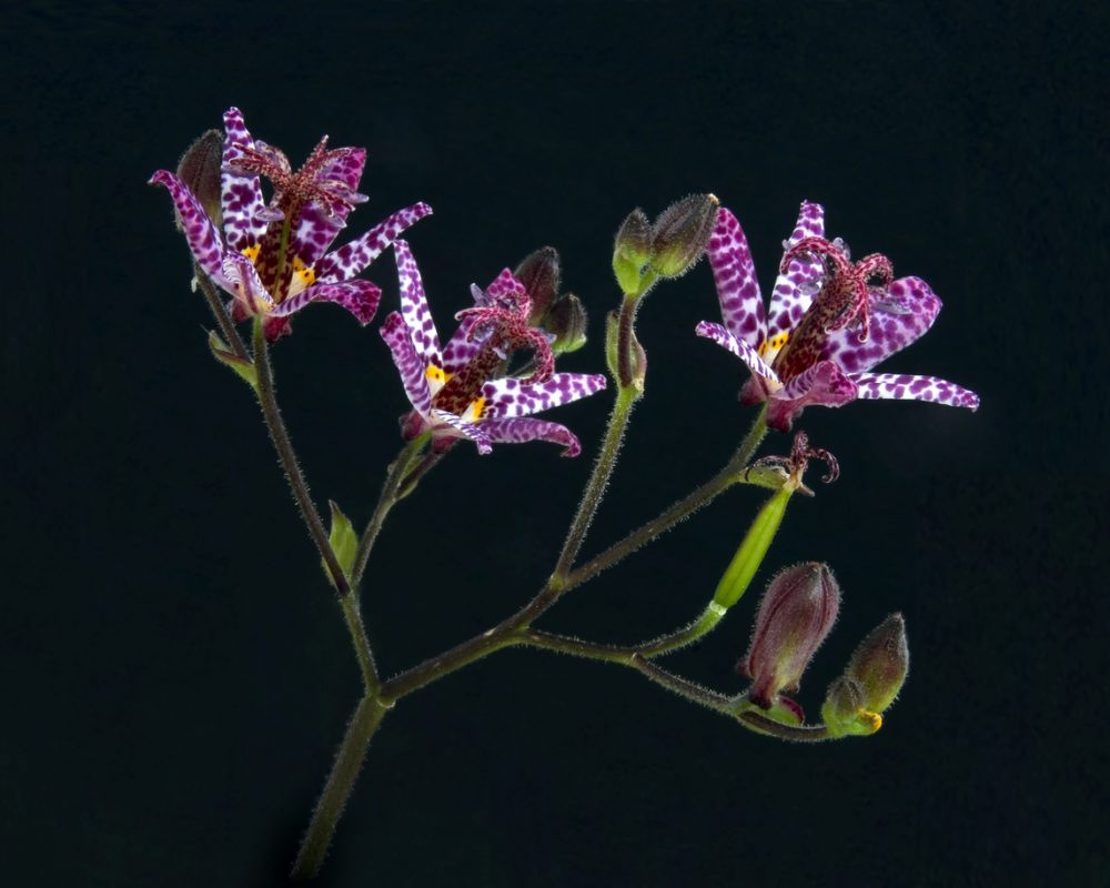Hij bloeit vanaf eind zomer tot de eerste vorst – met prachtige, gespikkelde bloemen: de paddenlelie (tricytris hirta).