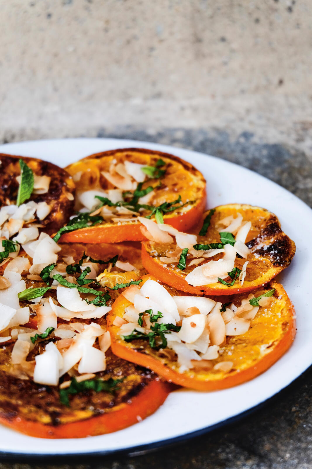 - Leg de plakken sinaasappel op een bord en bestrooi met het geroosterde kokosschaafsel en de fijn gehakte munt en druppel de honing erover.
