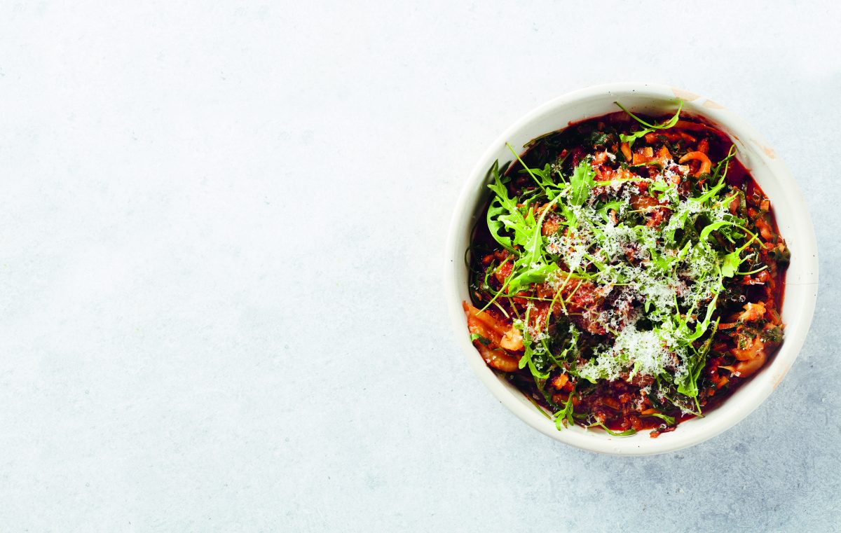 - Serveer en werk het geheel af met verse rucola, parmezaan, pijnboompitten en basilicum.
