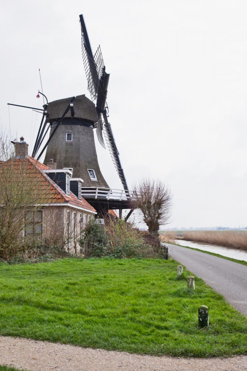 Weer terug op de eerste verdieping wijst ze naar twee deuren: een ‘súd westen wijn doar’ en een ‘noard easten wijn doar’. “Een korenmolen heeft altijd twee deuren, omdat je naar buiten moet kunnen om de molen te bedienen. Welke deur je gebruikt is afhankelijk van de wind – zuidwesten- of noordoostenwind – en hoe de wieken op dat moment staan.” Eenmaal buiten is het uitzicht over het Friese landschap adembenemend en oneindig, met landerijen zo ver je kunt zien. Een idyllisch geheel dat wordt versterkt door de Wytmarsumer Feart waaraan de molen ligt, bekend van de Elfstedentocht. “Als de wind gelijkmatig vanaf het open veld komt, dan is dat het fijnst om te malen”, zegt Christa. “Zoals op een mooie voorjaarsdag of niet te wilde herfstdag.” Maar aangezien het malen het hele jaar doorgaat, moet ze altijd op haar hoede zijn. Ze vertelt over de keer dat ze nog leerling was en het weer van het ene op het andere moment omsloeg. “Het was een zomerse dag en ineens pakten donkere wolken zich samen en ging het zwaar onweren. Niemand zag het aankomen en we moesten snel handelen; de zeilen van de wieken halen en de molen vastzetten, anders zou die op hol kunnen slaan. Ik leerde op dat moment dat je continu alert moet zijn, een rustige werkdag kan door de kracht van de natuur ineens veranderen in een gevaarlijke situatie. Maar áls je dat samenspel in de vingers hebt, dan ontstaat er een prachtig ambachtelijk product dat je samen met de elementen en die eeuwenoude molen toch maar mooi hebt gemaakt.”