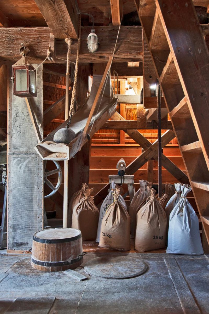 Zakken pas gemalen meel staan klaar voor gebruik in de bakkerij, die naast de molen ligt.