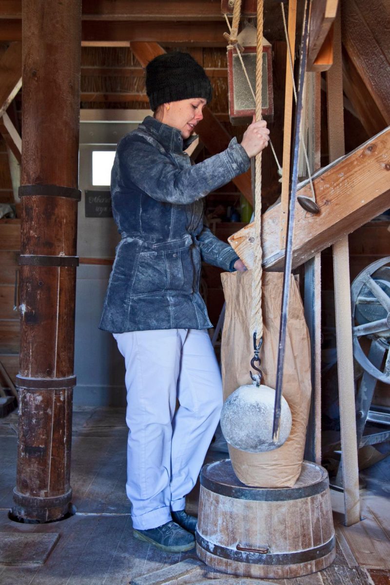 Maar voordat het bakken kan beginnen, moet het graan eerst vermalen worden. Christa klimt de steile trap op, naar de eerste verdieping van de molen. Hier lijkt het of de tijd heeft stilgestaan. Zware houten balken dragen de constructie en bovenin zie je een imposant houten tandwiel dat wordt aangedreven door de molenwieken – die vrolijk draaien in het vlakke Friese landschap. “Het tandwiel zorgt ervoor dat de molenstenen het graan verwerken tot meel”, legt Christa uit. Ze klimt nog een verdieping hoger, waar de molenstenen liggen. Uit een juten zak vol graan pakt ze een handje en knikt bewonderend: “Kijk eens hoe mooi.” Het graan gaat in een houten trechter en komt zo tussen de stenen terecht die het malen. “Als de loper, dat is de bovenste molensteen, over de stilstaande onderste steen, de ligger, schuift, klinkt dat als muziek. Wanneer ik dan ook nog de molenwieken hoor draaien, kom ik helemaal tot rust.” Het verse meel wordt vervolgens via de meelpijp, een houten geleider, in zakken opgevangen. “Eigenlijk is het principe heel eenvoudig.” Bij het malen van de korrels komt het vakmanschap om de hoek kijken. “De wind is nooit hetzelfde, het is elke dag weer maatwerk”, vertelt Christa. “Je moet al je zintuigen gebruiken. Luisteren naar het geluid van de stenen en de wind, het resultaat bekijken en zo nodig de stenen bijstellen.” Elke graansoort heeft zijn eigen ‘instelling’. “Tarwe is harder dan spelt, dus bij het malen van tarwe liggen de stenen dichter op elkaar. De vitamines en mineralen blijven zo behouden. In de fabriek, waar ze het meel voor regulier brood malen, worden korrels bijna helemaal uit elkaar gehaald en verwijderen ze delen, zoals de kiem. Maar meel met kiem is gezonder en heeft meer voedingsstoffen. Nadeel is dat het meel minder lang houdbaar is; je moet dus beter plannen. Dan is het handig dat je als molenaar zelf je brood kunt bakken.”