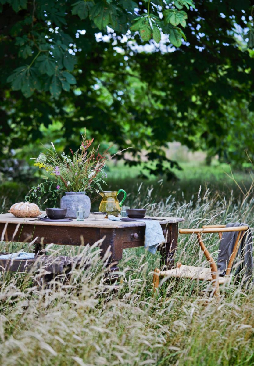 Dek je tafel in stijl met linnen servetten (stoerlinnen.nl, sostrenegrene.com), handgemaakt keramiek (rootfolk.com, loberon.nl) en glaswerk van de kringloopwinkel. Stoelen van bamboe of rotan zijn licht van gewicht en verplaats je dus makkelijk naar de beste plek. Een vaas met veldbloemen maakt het plaatje af.