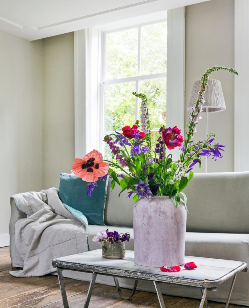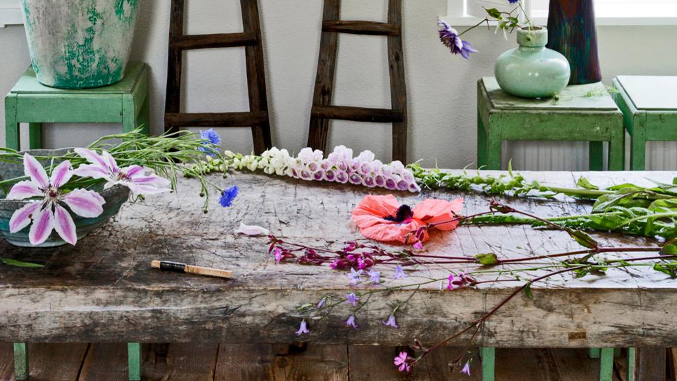 Pluk, als je ze in de tuin hebt staan, ook wat vingerhoedskruid (trek handschoenen aan, want giftig), ridderspoor en lamsoor. Voor een natuurlijk en speels effect snijd je de stelen op verschillende lengtes af.