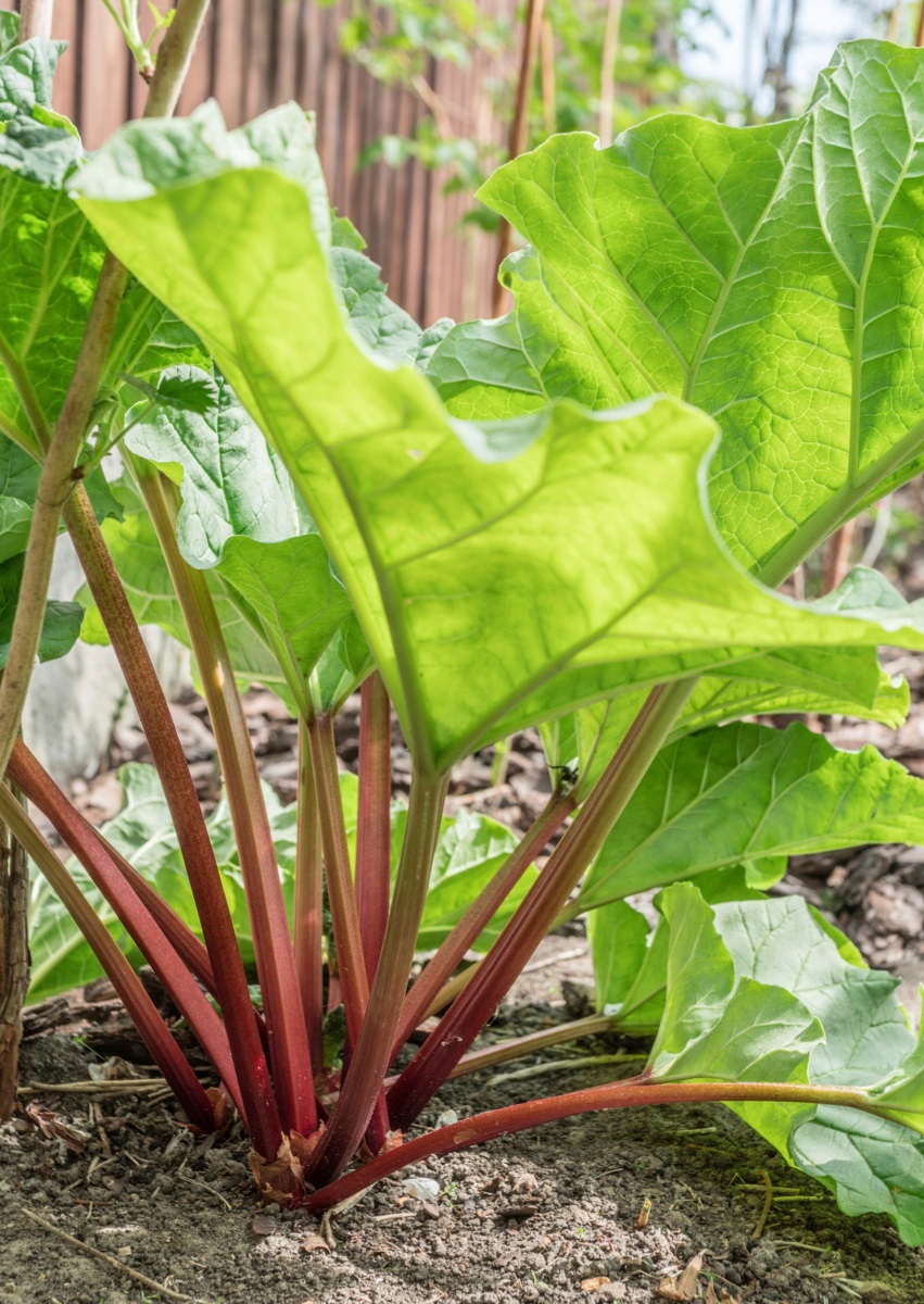 De jonge rode bladstelen van rabarber (Rheum rhabarbarum) eet je in zoete gerechten. TIP Trek van het grote blad in een emmer water een gier en gebruik die als vloeibare mest. BLOEI juni HOOGTE 100 cm STANDPLAATS halfschaduw