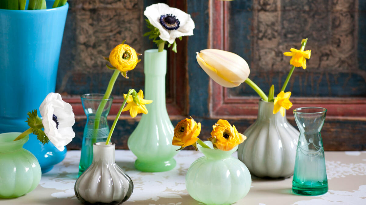 Maak een selectie van je mooiste vaasjes en ga daarbij voor één thema. Kies bijvoorbeeld een bepaalde kleur of steeds hetzelfde materiaal, zoals hier voor glas is gekozen. Zo maak je er een geheel van en hou je het totaalbeeld rustig. Wij kozen hier voor gele voorjaarsbloemen, maar je kunt natuurlijk ook gaan voor een paarse voorjaarsbloem, of -als je er genoeg van kunt vinden- blauwe voorjaarsbloemen. Het is mooi om al die verschillende tinten blauw, geel of elke andere kleur bij elkaar te zien. Wij gebruikten deze bloemen: narcis, tulp, ranonkel en (witte) anemoon.
