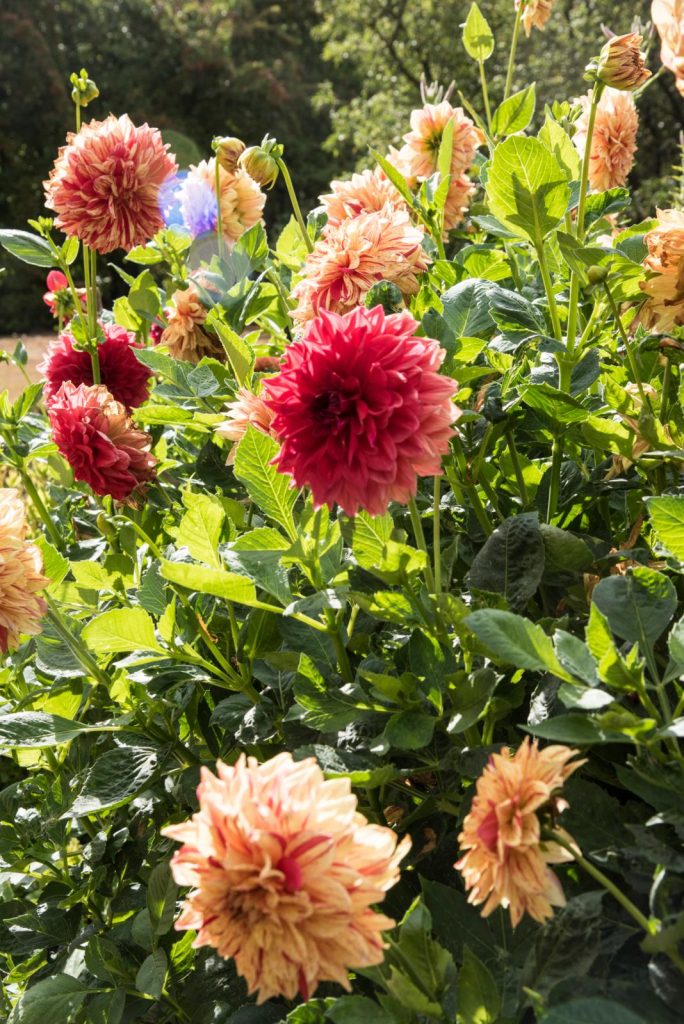 Maria en Piets favoriete plekje om na een drukke dag in de tuin te genieten van de avondzon is beslist het kleine, met haagjes omzoomde terrasje onder het donkere gebladerde van een Prunus cerasifera ‘Nigra’. Ook hier zijn uitbundige bloembedden, maar dan van donkerbladige Heuchera, wijnrode duizendknoop, opgelicht door felrode dahlia’s. “De donkere tinten verstillen en maken de plek intiem”, legt Maria uit. “Bovendien ogen de rode tinten prachtig in het avondlicht.”