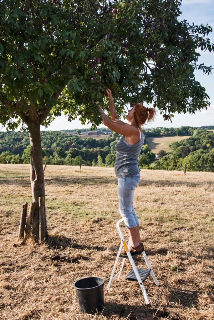 Wanneer het wat is afgekoeld, maakt Maria zich klaar om fruit te plukken in de boomgaard. De takken van de fruitbomen hangen zwaar onder de last van hun vruchten. “Niet alleen smaakt eigen gekweekt fruit direct van de boom heerlijk uit het vuistje, van de appels, peren en pruimen laat ik sappen persen die ik tijdens de Open Tuindagen aanbied aan de bezoekers”, vertelt ze terwijl ze in een appel bijt. “Deze kunnen nog even wachten, maar voor de pruimen wordt het tijd dat ze worden geplukt.” Maria loopt met een kennersblik het rijtje pruimelaars af. Ze houdt halt bij een zwaar gevulde boom met donkere vruchten, proeft en knikt goedkeurend. “Ik pluk de pruimen het liefst als ze niet te rijp zijn, maar nog een tikkeltje zurig”, zegt ze terwijl ze me er eentje aanreikt. “Afspoelen hoeft niet, want alles is hier natuurlijk”, verzekert ze me. De paarsgroene vrucht met zijn matfluwelen huid smaakt verrukkelijk. “Het werk stopt nooit, maar het is hier heerlijk toeven”, verzucht Maria van boven op de ladder. En dat kan ik alleen maar beamen.
