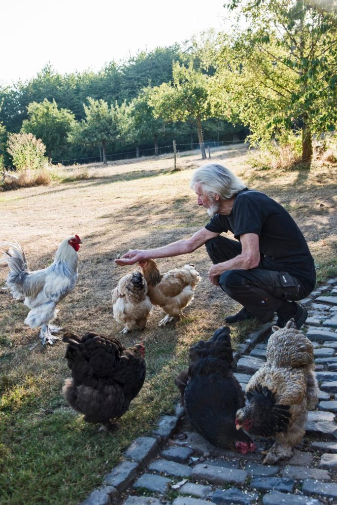 Ze troont me mee naar de kippenren, of wat daarvoor moet doorgaan, want ook de dieren hebben hier hun vrijheid en genieten van een heuse loopweide. Piet is duchtig aan het werk met een hakmesje om het stenen looppad onkruidvrij te maken. “Het enige werkje dat ik in de tuin verricht”, lacht hij terwijl hij zijn vrouw een figuurlijke pluim toewuift. Rond hem scharrelen kippen getooid met pluimensokken. “Brahma’s”, zegt Piet. “Ondanks hun indrukwekkende verschijning – een kloeke hen weegt zo’n vier kilogram en doe er voor de haan nog maar een kilo bij – zijn ze zeer zachtaardig. Onze eerste Brahma’s sliepen in de bomen, zoals hun natuur het voorschrijft, maar sinds minder aangename bezoekjes van vossen en andere roofdieren als dassen en wilde katten houden we ze ’s nachts onder dak.”