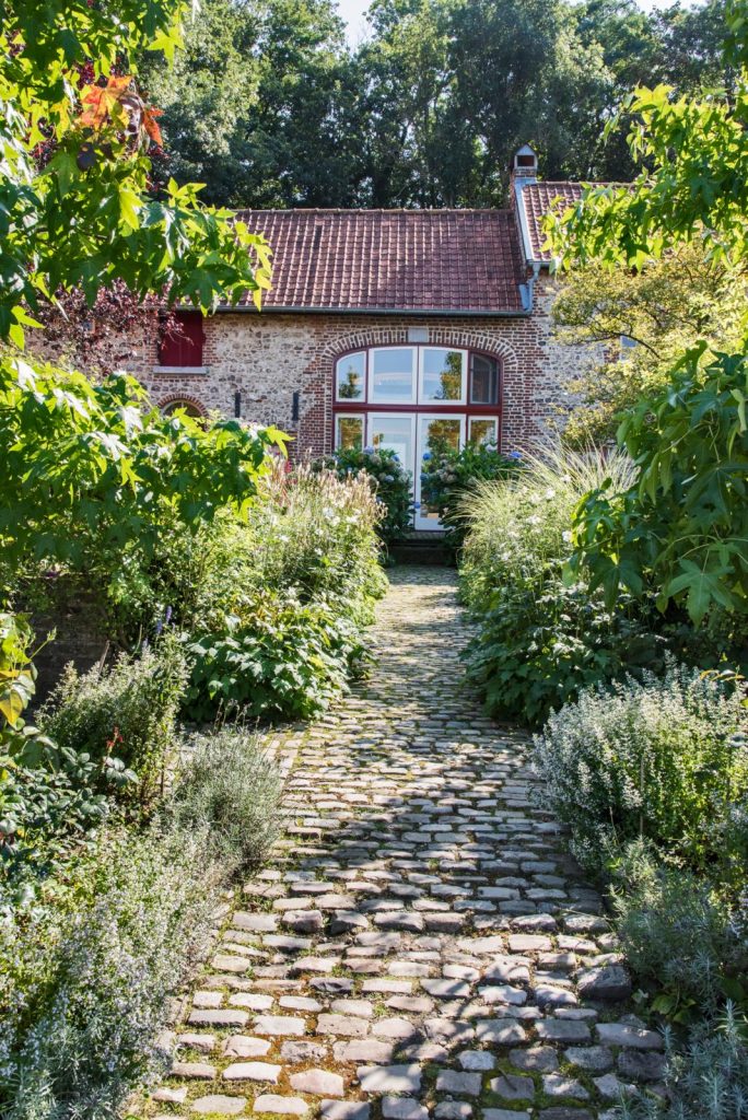 “Alles was overwoekerd door brandnetels, braam en berenklauw”, herinnert Maria zich. “Uit elk plantgat haalde ik kilo’s steenpuin. Maar we hadden er zin in en al gauw werd de restauratie en de aanleg een echte verslaving.” Langzaam maar zeker ontpopte de tuin zich tot een pareltje. De hoeve, gebouwd ten tijde van Napoleon, kreeg zijn oude glorie terug dankzij het ambachtelijke vakwerk van Piet bijgestaan door bekwame vaklui uit de streek. Met de aanleg van het basisplan waarvoor Maria beroep had gedaan op de tuinarchitecten van het Nederlandse De Heerenhof, kreeg ook het terrein structuur. Het plan omvatte zes terrassen, elk met een aparte sfeer en functie, al naargelang het moment van de dag. Voor de invulling van de bloemperken en de borders zorgde Maria zelf. “Ik ging wekelijks naar de plantenkweker en liet me spontaan leiden door de kleur en bloeiwijze van de planten… en vooral door mijn buikgevoel”, lacht ze. “De binnenplaats aan de voorzijde van het huis, geplaveid met kinderkopjes