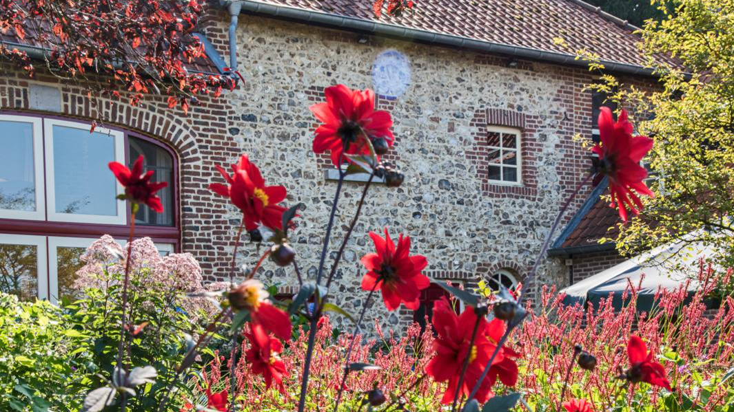 Op een warme, nazomerse dag tref ik Maria aan te midden van metershoge bloemborders gevuld met kaarsjeskruid, Veronica’s en salvia’s. Ze is druk in de weer met het wieden van onkruid, maar staakt meteen haar werkzaamheden voor een kopje thee. Ondertussen vertelt ze van alles over de bijzondere geschiedenis van het landgoed.