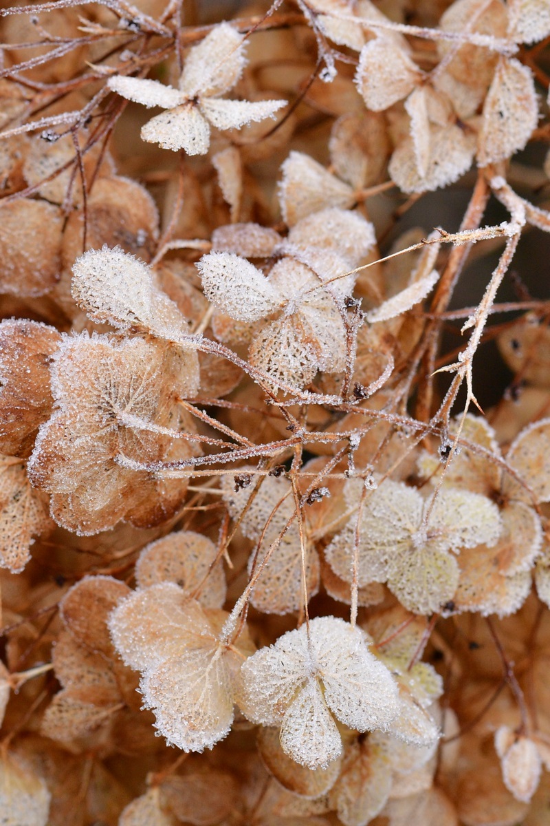 - Echinacea (zonnehoed): “De bloemharten – rond en stekelig of kegelvormig – zijn met sneeuw net ijsjes op stokjes.”