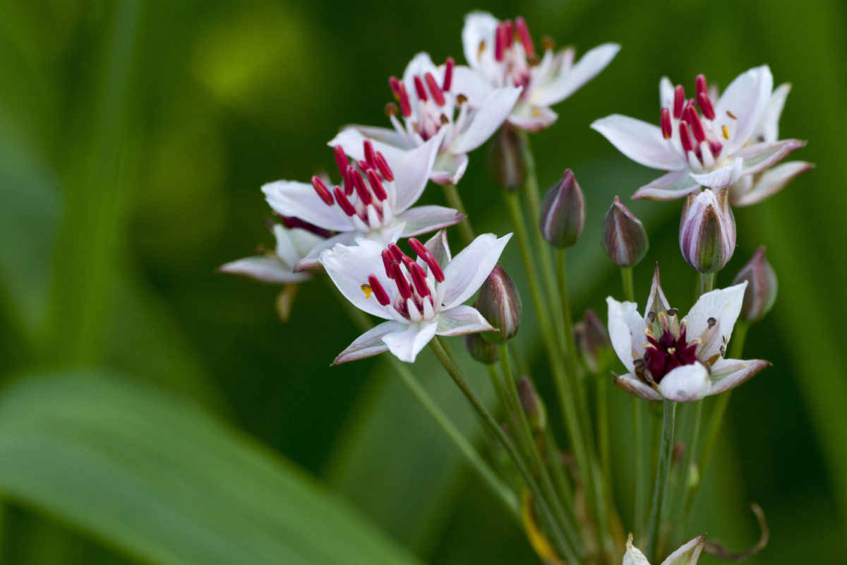 Zwanenbloem bloeit met schermen van lieflijke roze bloemetjes, aan hoge stelen. Het is een inheemse plant die gegarandeerd insecten naar je vijver lokt, en die ook nog eens goed is voor de waterkwaliteit.