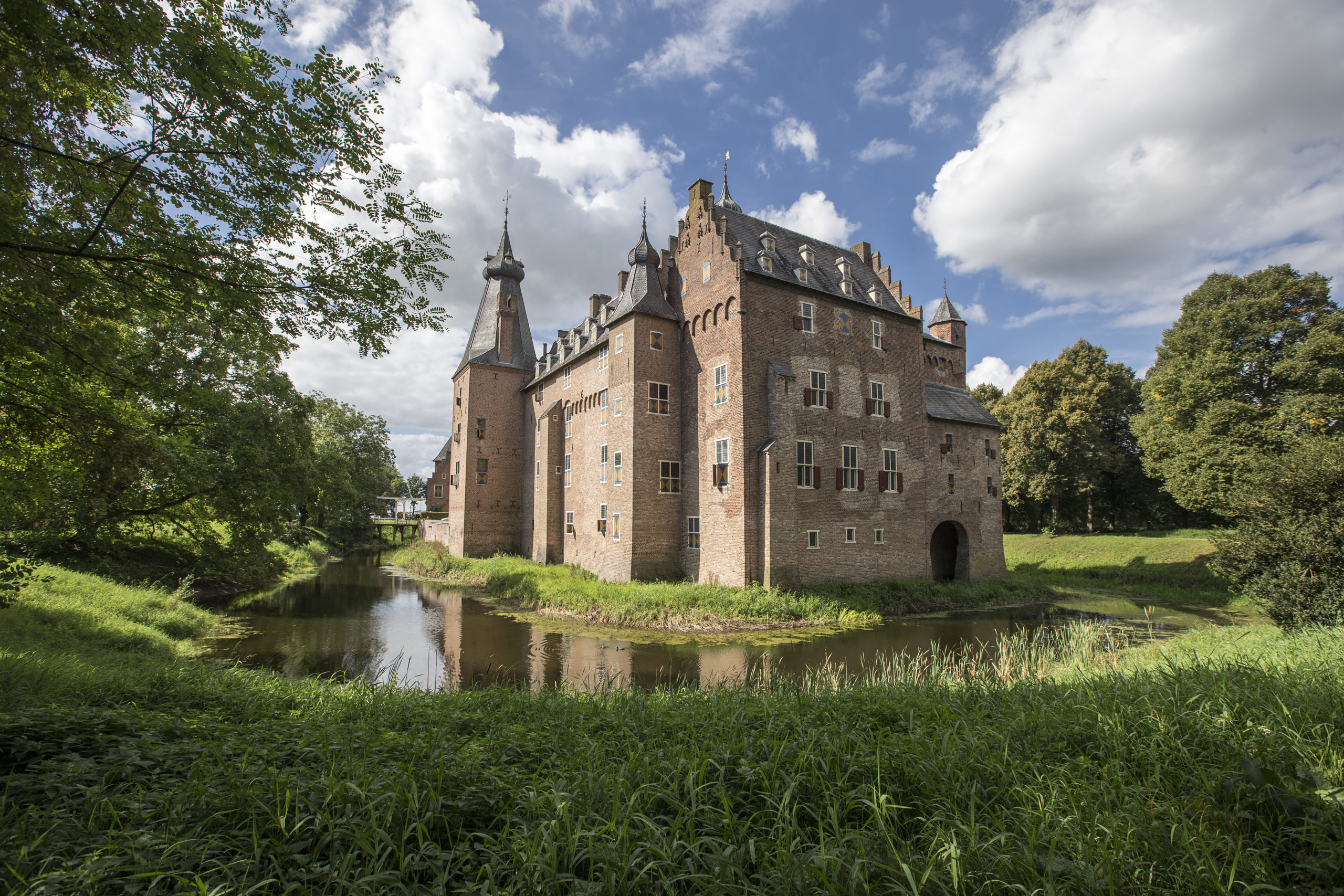 We rijden naar kasteel Doorwerth in Gelderland via een heuse allee van een kilometer of twee. Links ligt een oude boomgaard, rechts zien we uiterwaarden, met paarden en runderen. We wanen ons in de riddertijd, zo puur en verstild is het hier. Dan zien we het poortgebouw opdoemen. We parkeren links van de ophaalbrug en gaan te voet de kasteelgracht over. Indrukwekkend zijn de enorme, geelblauwe luiken – de kleuren van kasteel Doorwerth – waarmee de beide zijden van het poortgebouw kunnen worden afgesloten. Als we onder de poort door zijn, zien we links bij de grote poort twee rode deuren; eenmaal binnen beklimmen we een stenen wenteltrap. Door een rode deur biedt een glazen deur – met een afbeelding van het kasteel erop – alvast een doorkijkje naar ons onderkomen. Wat een ruimte! Links is een bar, met daarachter de ruime keuken. Bijzonder is ook dat we links en rechts naar buiten kunnen kijken. Links op de royale binnentuin en de kasteelmuur met leibomen die ertegenaan groeien. En rechts over de gracht, richting de uiterwaarden van de Rijn. Wat een speciale plek!