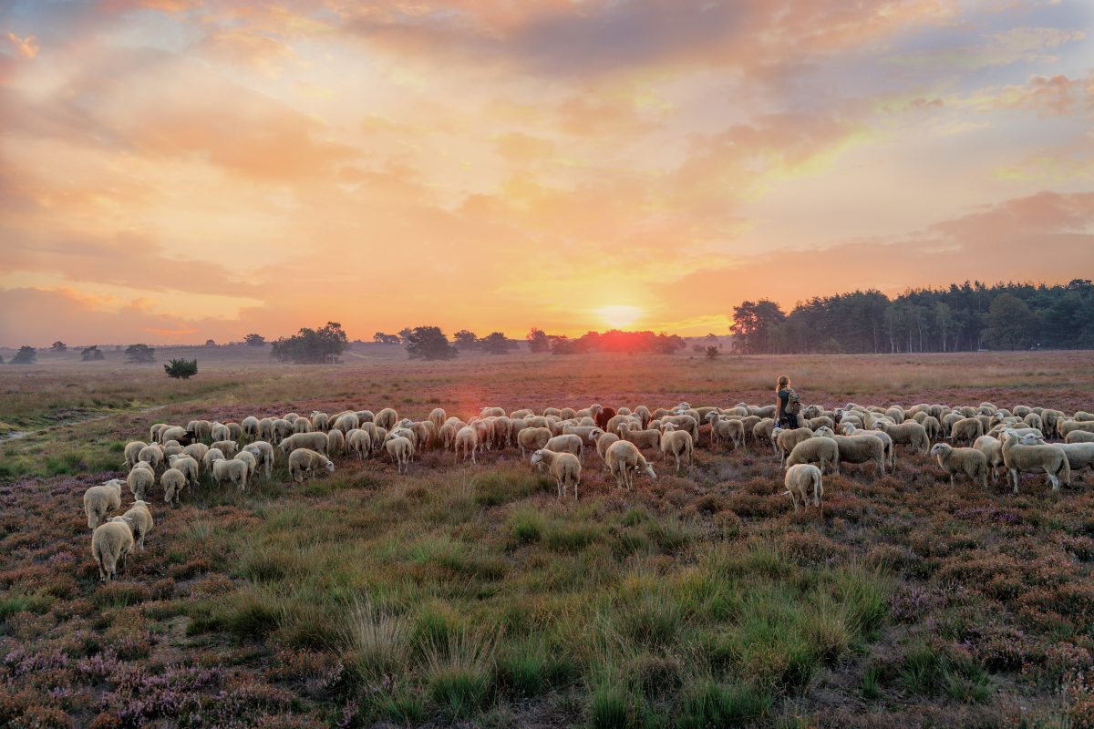 Netherlands, Elspeet, Elspeetse heide met schaapsherder Daphne van Zomeren