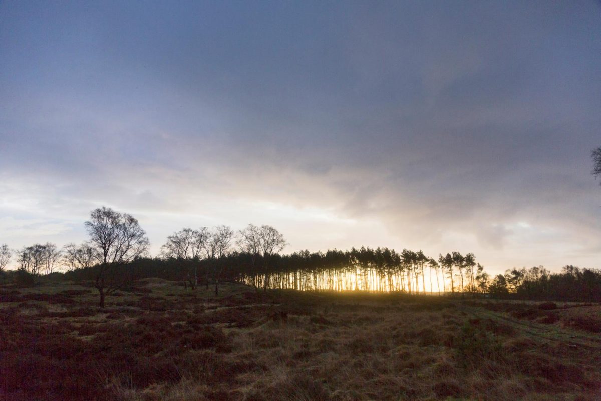 We zijn in Het Nationale Park De Hoge Veluwe, één van de twee officiële leefgebieden van het wilde zwijn, hoewel er nog wel wat illegale groepen her en der in Nederland voorkomen. Een paar uur eerder zaten we nog in het donker koffie te drinken rond een kampvuur om de stramme en koude ledematen wat op te warmen. Eén keer per jaar organiseert het Park een tweedaagse winterkampeer-safari en het mag dan ook bijzonder heten dat wij daar bij mochten zijn. De overnachting vond plaats in een hooischuur die – zoals gebruikelijk – aan de bovenkant open is, en ondanks het hooi waarin we lagen en de warme slaapzakken was het een koude nacht met vorst geweest.