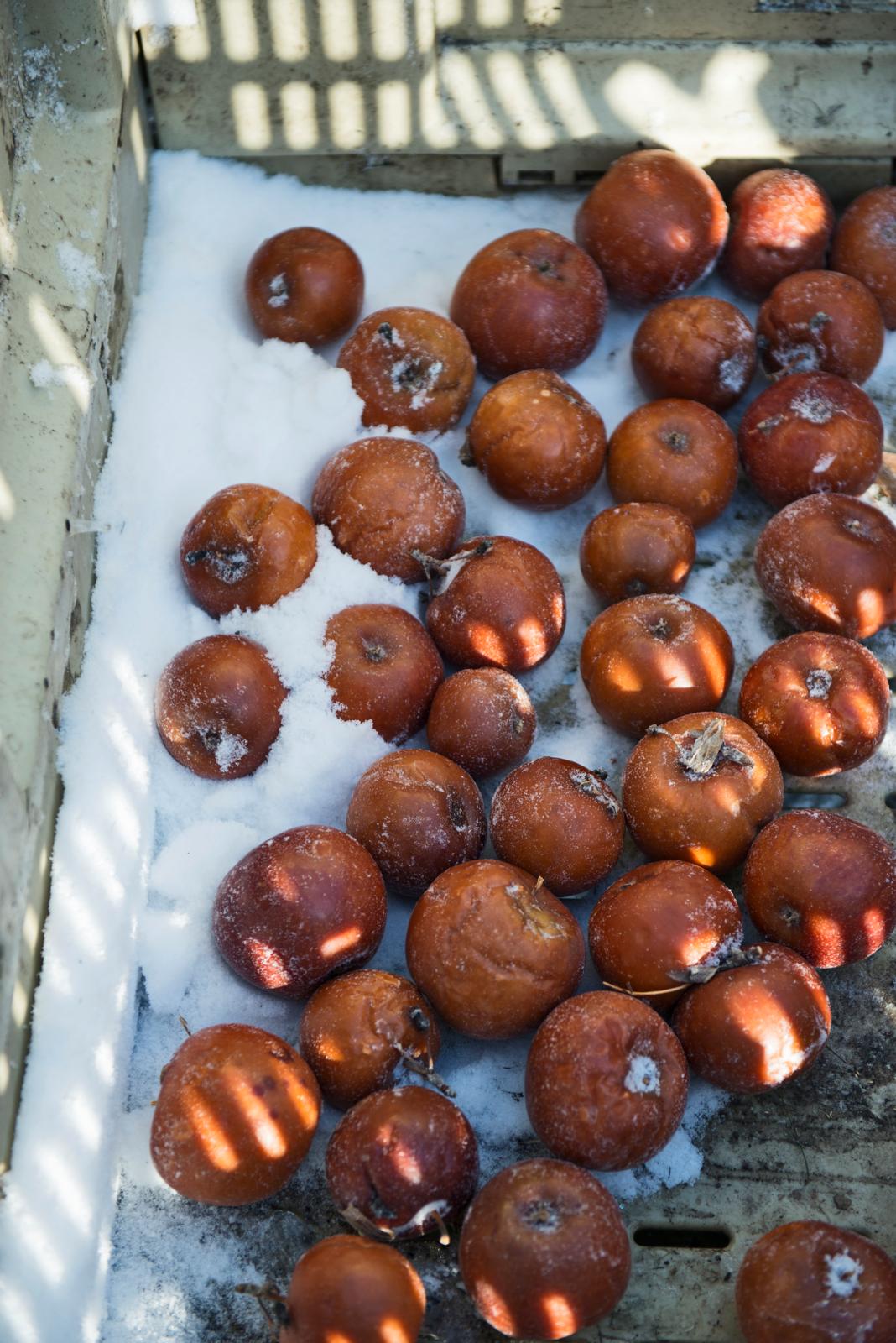 Christel: François staat me al op te wachten om me mee te nemen naar zijn immense boomgaard. Ik ontdek een betoverend spektakel. Een helderblauwe lucht schittert boven een verstild sneeuwtapijt. De rode, bevroren appeltjes steken opvallend af tussen al dat wit; een fascinerend kleurencontrast. “Dit zijn de laatste appelen die we hartje winter plukken”, zegt hij terwijl hij voorzichtig de keiharde appeltjes bij hun steel van de bomen wrikt. “Het verhaal van ijscider begint bij de Canadese ijswijn”, legt hij uit. De druiven voor deze wijn blijven lange tijd aan de wijnranken hangen en worden pas in de winterperiode geplukt. “Zo’n dertig jaar geleden raakten we geïnspireerd door deze techniek. Appels zijn voor ijscider wat druiven zijn voor ijswijn, het productieproces is vrijwel identiek. Door de appels aan de boom te laten hangen tijdens de winterkou, ontdekten we dat de natuurlijke suikers in de appels concentreren.”