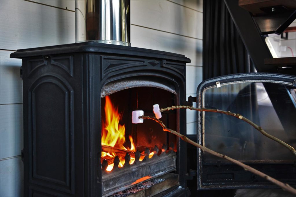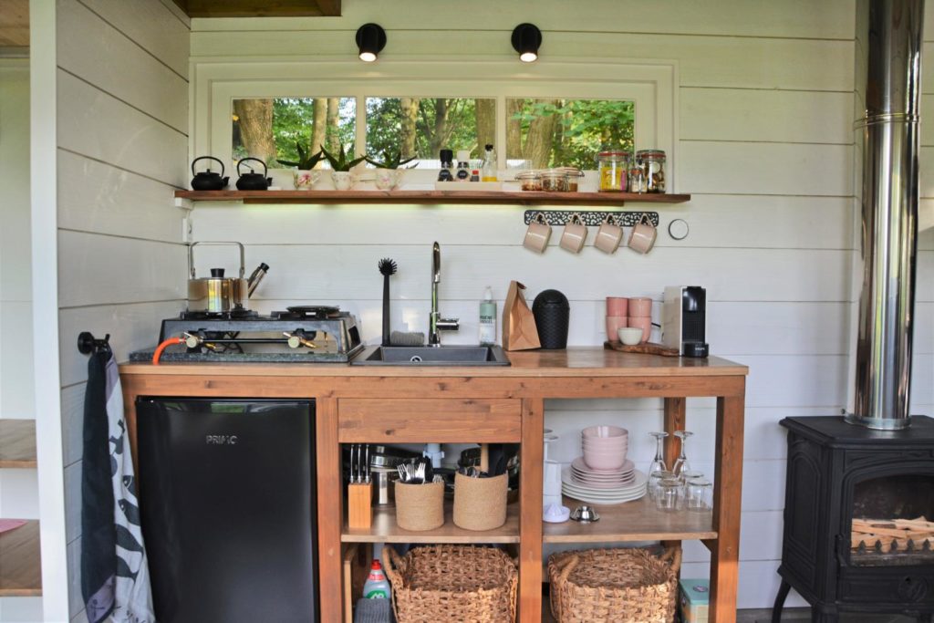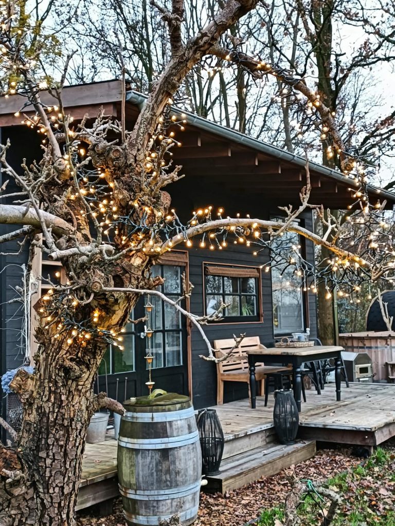 Als we de auto parkeren op Landgoed de Kievit in het Belgische Meersel-Dreef, net over de grens met België, toveren de laatste zonnestralen de wolken roze. Via een slingerend bospad lopen we naar het Tiny house. Ernaast knappert al een vuurtje in de kachel die het water van de hottub verwarmt. Dat is nog eens een warm welkom! Slingers lichtjes, windlichten en kaarsen verlichten de omgeving van het huisje.