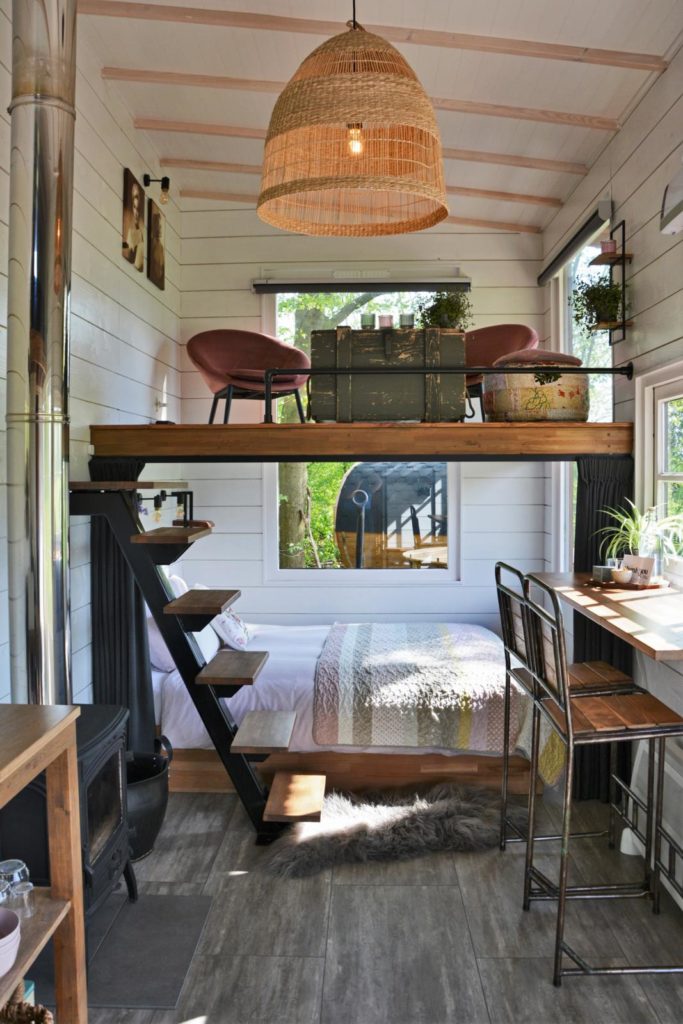 “Precies de juiste plek voor het Tiny house vinden, kostte nog best wat tijd en schuifwerk. Het uitzicht, het gevoel van vrijheid, kunnen ademen – alles moest goed zijn.” Dat is gelukt. Je voelt de liefde en zorg waarmee alles is bedacht en gemaakt. Binnen is elke kubieke meter slim benut. Met een eetbar, houtkachel en een royaal twee- persoonsbed rechts beneden. Op de vide erboven is een gezellig zitje. Links van de entree is de badkamer, op de vide daarboven is nog een tweede slaapplek. Dankzij grote ramen is het binnen heel licht én heb je overal prachtig uitzicht.