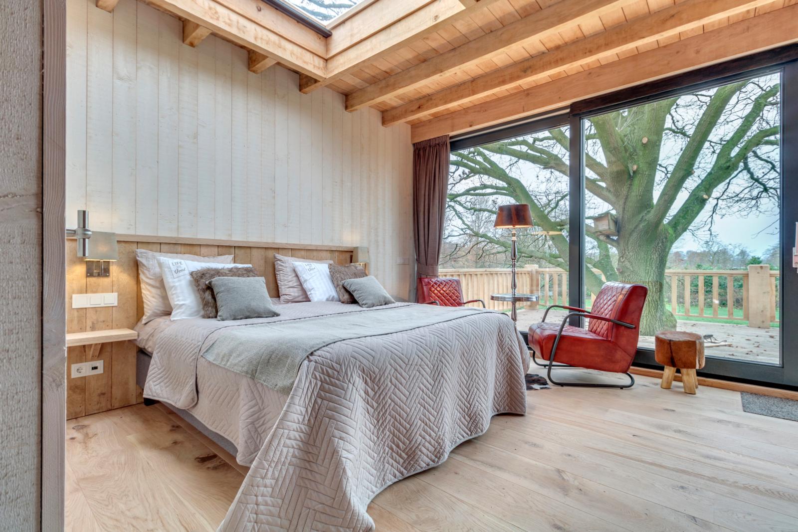Als je binnenkomt en de boomsuite inloopt, valt je oog meteen op het royale dakterras en de majestueuze eik die er middenin staat. Pas daarna ontdek je de kitchenette, Finse sauna, ruime badkamer met regendouche en het heerlijke bed. Door de lichtkoepel erboven kunnen we de sterren aan de hemel tellen. Een enorme schuifpui geeft toegang tot het ruime dakterras. Alle details kloppen, overal is aan gedacht. Alles ademt rust, luxe en privacy. “Ja, als we het doen, doen we het goed”, voegt Mandy toe.