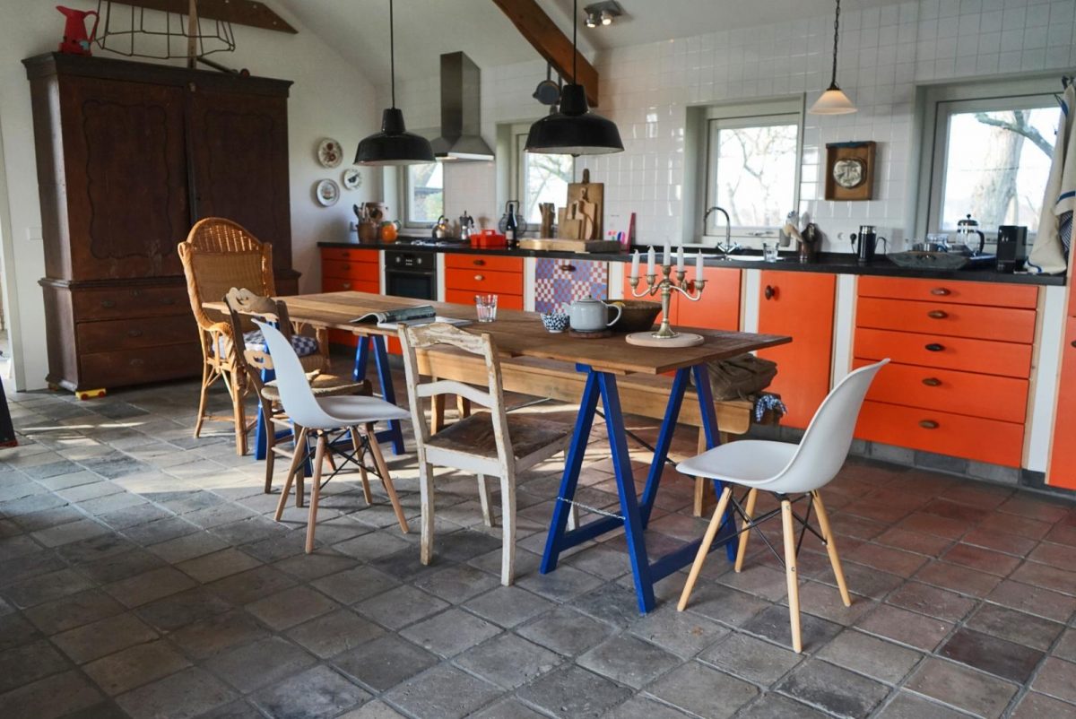 Je ziet dat het interieur met liefde en aandacht is samengesteld. “Veel voorwerpen kennen een boerengeschiedenis. Een oude hooimand dient hier als lamp, een linnenkast als servieskast. Erin staan kringloopvondsten en servies uit een oude boerderij.” Opvallende details: een vrolijk gekleurde keuken, een Deense houtkachel, een rijkelijk gevulde boekenkast, een hobbelpaard “dat volgens Scandinavisch gebruik geluk brengt in huis”. Hoe langer je kijkt, hoe meer details je ziet. Speelgoedwagonnetjes als ‘poten’ onder de servieskast, het locomotiefje erbovenop; de tv op een schildersezel; een gedicht aan de binnenkant van een kast. In de slaapkamer heeft het bed een hoofdbord van een oude deur. En waar je ook bent, altijd is er een venster op de natuur. Plotseling zien we de zon nog even. De laatste stralen weerspiegelen oranjerood in het water.