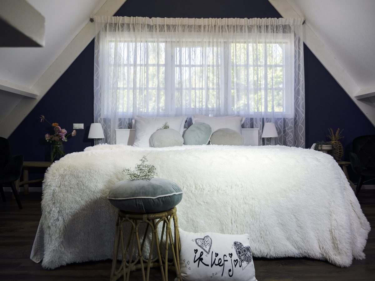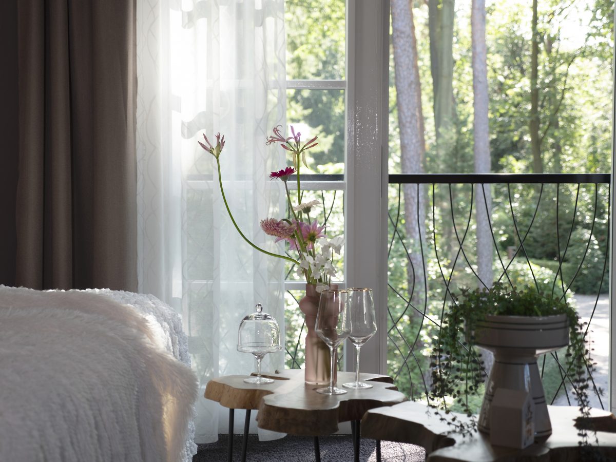 De geschiedenis van SonneVallei begon zo’n 25 jaar geleden, toen Wilma en André net buiten Harderwijk de voormalige tbc-kliniek Sonnevanck ontdekten. Ze werden verliefd op het terrein, kochten een stuk grond, zetten er klapstoelen neer en gingen hun droomkasteel tekenen. Dat was de start van een sprookje dat werkelijkheid werd. Wilma: “Het ontstaan van onze vallei was een groot avontuur. André begon huizen te ontwerpen, van heel modern tot klassiek. Uiteindelijk zijn we tot ons droomhuis gekomen.” André: “Wilma is kunstenares en op een gegeven moment stond de inpandige garage vol schilderijen. Omdat ik ook meer werkruimte nodig had, besloten we een koetshuis te bouwen. In onze parkachtige bostuin is flink wat hoogteverschil en het nieuwe pand wilden we laten aansluiten op de natuurlijke glooiing. Daarom groeven we een stuk grond uit, waardoor er extra ruimte ontstond, het niveauverschil gehandhaafd bleef en er extra geborgenheid ontstond.” Als je voor de entree van het koetshuis staat, is links een grote veranda waar je als gast heerlijk kunt zitten. Rechts is Wilma’s galerie en atelier en daar tussenin is een trap naar de ruimte erboven. Wilma: “De vraag was: wat doen we daarmee? André en ik houden van reuring en gezelligheid. Zo ontstond het idee om er twee appartementen in te maken. Bij alles vroegen we ons af: hoe zouden we dat zelf willen, als we ergens logeren? André en ik streven naar perfectie, wat we doen, doen we goed. We willen een belevenis van geluk, liefde, ontspanning en inspiratie bieden. Dat maakt iedereen blij.” En blij word je hier zeker: letterlijk de drukke wereld achter je laten en even een stukje BosVreugde of HemelsGeluk ervaren. Zo heten de appartementen, gebaseerd op de kleurstelling en het materiaalgebruik. Al is de indeling vrijwel identiek, beide hebben een eigen karakter.