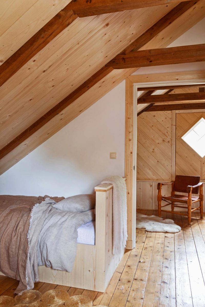 De Lemelerberg is een officieel natuurgebied. Daarom is er geen riolering of water-, elektriciteit- of gasaansluiting. “Je leeft hier echt ‘off-grid’, aldus Marianne. “Slow living dus, daar is het huis ook op ingericht. We hebben alleen aangepast wat nodig was, met materialen die passen bij het chalet. De houtkachel op de benedenverdieping stond er bijvoorbeeld al. De wanden beneden zijn authentiek, net als de vloer. Boven hebben we die alleen geschuurd en gelakt. Bij het creëren van de slaapkamers is wel dakisolatie aangebracht, simpelweg omdat het er anders te koud zou zijn.” Het interieur is basic, puur, in Shakerstijl. Zoals de comfortabele, met linnen beklede bank, fijne rotan fauteuil en eenvoudige houten stoelen om de tafel. Vroeger gebruikten de bewoners gasverlichting, nu is er elektriciteit, dankzij zonnepanelen op de veranda-overkapping. Er is een toilet, een wastafel en stromend water op basis van gefilterd regenwater. Douchen kan op de nabijgelegen natuurcamping en extra drinkwater haal je – als de aanwezige jerrycans leeg zijn – met de bolderwagen bij de boer onder aan de berg.