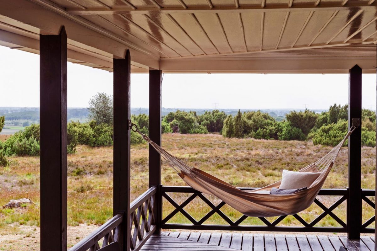 De Lemelerberg is met z’n 1.000 hectare het grootste natuurterrein van Landschap Overijssel en is door de Europese Unie aangewezen als beschermd natuurgebied. In bijna een eeuw tijd is het terrein niet of nauwelijks veranderd. Op de hei rond het chalet groeien berken, eiken en jeneverbesstruiken. Je kunt hier urenlang wandelen, er zijn tal van routes om uit te kiezen. Daarna kun je op de veranda lekker bijkomen. Of een vuurtje stoken in de houtkachel, haardhout is er voldoende. En anders haal je gewoon een nieuwe lading uit het houthok. Een hakblok en een bijl staan klaar om aanmaakhoutjes te kloven. Het draagt allemaal bij aan het slow living-gevoel. Een kop vers gezette koffie erbij en genieten van het uitzicht op het omliggende dal. Je vertraagt hier als vanzelf, de hectiek van alledag is snel vergeten.
