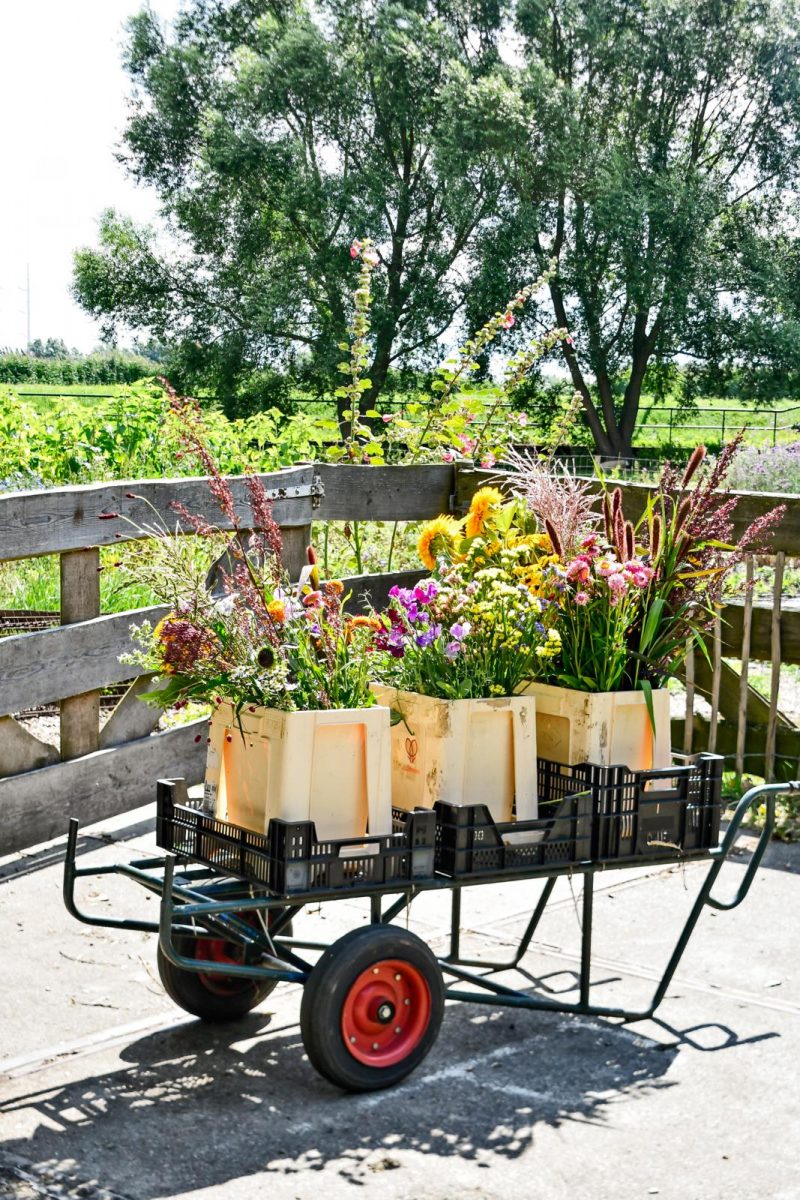 Als je goed kijkt, zie je dat de bloembedden iets bol liggen, voor een betere afwatering. Mariette: “Als het om water gaat telt elke centimeter, zeker op zware kleigrond.” Spitten doet ze niet, na de bloei wordt het plantafval afgedekt met zwaar gronddoek om het te laten verteren. Op deze manier verbetert ze de grond, waardoor ze al na drie weken opnieuw kan zaaien en zodoende het hele seizoen benut om te kunnen plukken. ’s Morgens, voordat de zon hoog staat, worden de bloemen gesneden. Mariette vertelt dat daar veel vakkennis bij komt kijken, omdat het plukstadium per bloem verschilt. “De bloemen moeten minstens een week mooi blijven, dus is het belangrijk dat we dit goed doen.” Ze geeft als tip dat je een dahlia pas moet snijden wanneer de bloem open is.