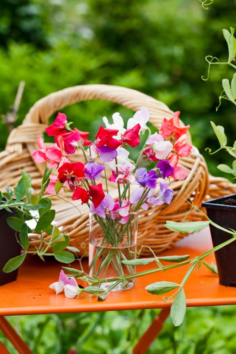 NB: Voor terras, balkon en hangmanden zijn Lathyrus odoratus ‘Bijou’ en ‘Cupid’ ideaal, want ze worden maar 30 cm hoog. ‘Bijou’ bloeit met roze, lila, rode, paarse en lavendelkleurige bloemen, ‘Cupid’ met roze met witte bloemen. Je kunt er wat takken bij steken waar ze zich aan vast kunnen grijpen, maar dat hoeft niet per se. Het heeft een mooi effect als ze in een hoge pot of hangmand hun bloeiende ranken over de rand draperen.