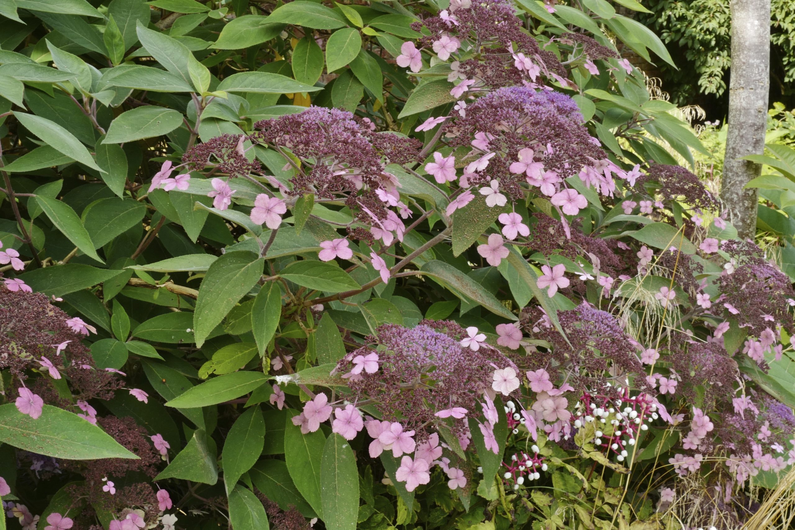 “Deze subtiele Aziatische schermbloemige hortensia met zijn lange, smalle, viltig behaarde bladeren is van nature een bewoner van de bosrand. Op wat koelere standplaatsen, liefst een flink deel van de dag in de schaduw en met zijn voeten in humusrijke bosgrond, is de plant een topper. De bodem onder de hortensia moet het liefst begroeid zijn, directe zoninstraling op de wortels is niet ideaal. Zoals altijd hebben kwekers en plantenliefhebbers naar hartenlust geselecteerd in de soort om de mooiste varianten te kunnen kweken. Een groot zwak heb ik voor de Engelse introductie die ik ooit vond in de tuin van mevrouw Bullivant, de Stourton House Flower Garden. Centraal in deze cottagetuin stond prachtig Hydrangea villosa. Heel wat jaren eerder als zaadje door haar man Anthony meegenomen op een botanische expeditie in China. Een topplant, heel rijk bloeiend met een intense bloemkleur. Toen ik haar vroeg om een stekje deelde ze die direct met me, plantenliefhebbers zijn altijd heel gul. Ik vroeg natuurlijk naar de naam van deze specifieke kloon, maar ze had er nooit een naam aan gegeven. Ter plekke besloten we hem naar haar kort tevoren overleden echtgenoot Anthony te noemen. Hydrangea villosa ‘Anthony Bullivant’ zag het daglicht.”