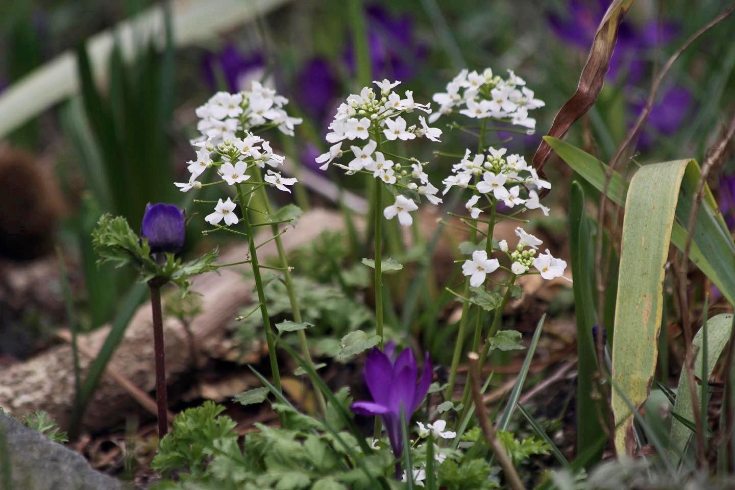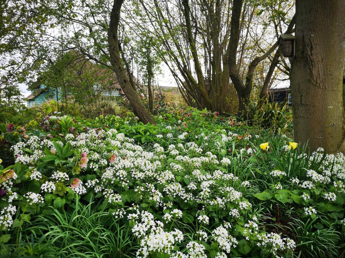 “Een verrassende maar subtiele verschijning vormen de helderwitte clusters bloemen van de Kaukasische look-zonder-look. Als lid van de kruisbloemige familie heeft deze Pachyphragma macrophyllum de kenmerkende vierdelige bloempjes die we ook kennen van pinksterbloem of judaspenning, wat een wat wilde uitstraling geeft. Perfect in de verder nog prille voorjaarstuin en als mengplant voor al die bloeiende bollen.”