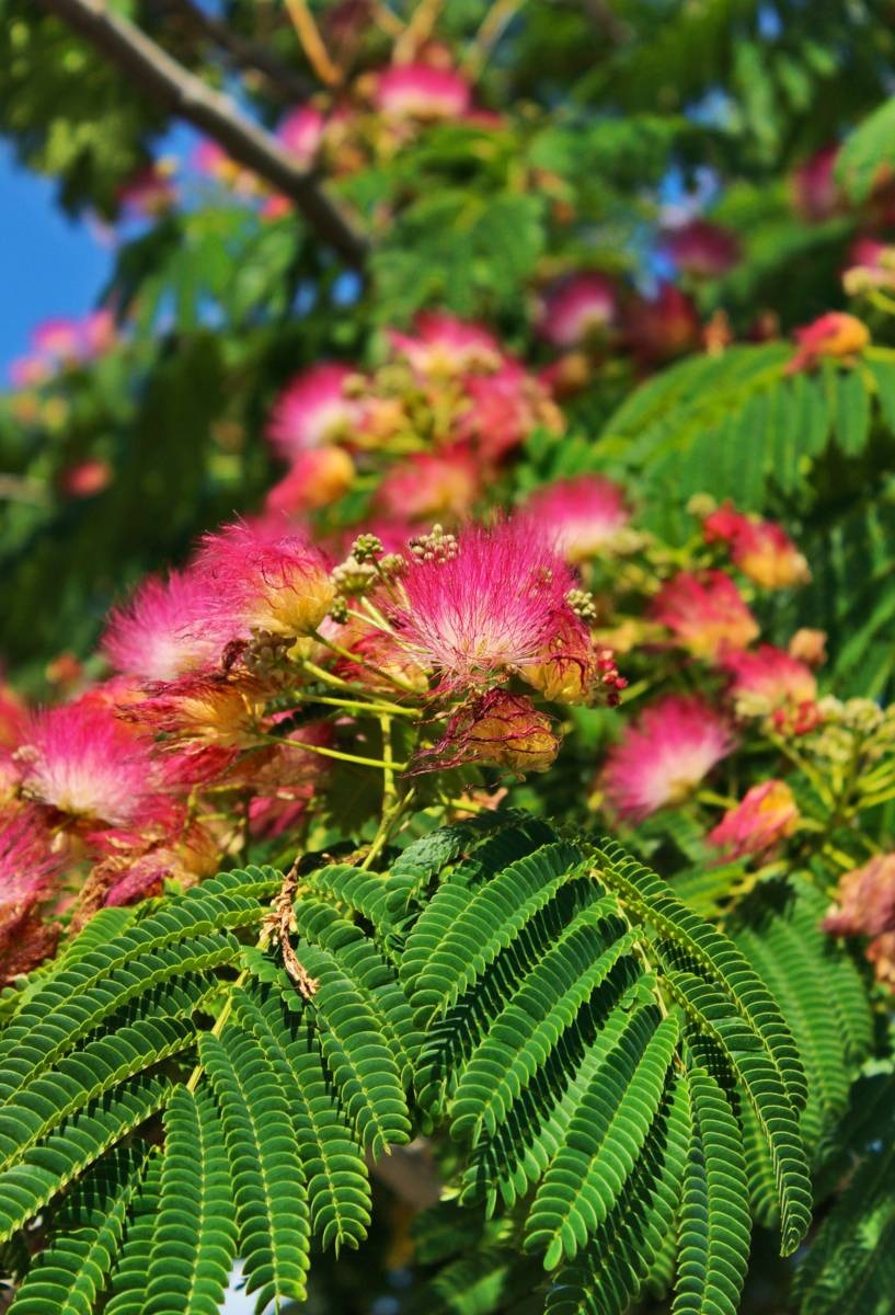 De pluizige roze bloemen en het prachtige, dubbel geveerde blad van de Perzische slaapboom doen denken aan flaneren op Franse boulevards. Op een warme, zonnige dag geeft de boom gefilterde schaduw. Hoogte 3-4 m. Bloei juli-augustus. Standplaats zon. SAMENSTELLING Mirjam Roskamp en Marie Tromp | FOTOGRAFIE iStock Lees hier alles over mediterrane kuipplanten.